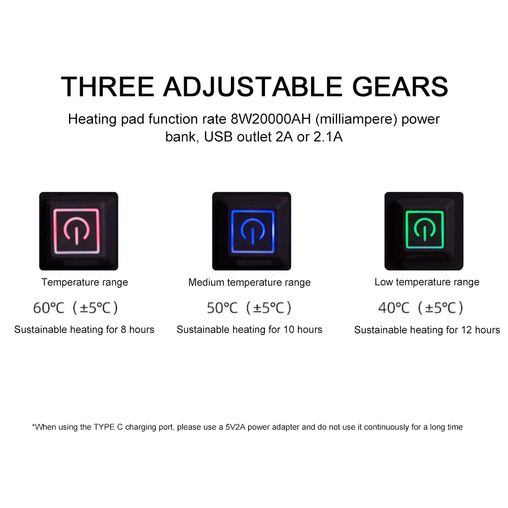 Endurance: 20000mah Charging Treasure For Example, High Temperature Gear Can Continue To Heat 8 Hours, Medium Temperature Gear Can Continue To Heat 10 Hours, Low Temperature Gear Can Continue To Heat 12 Hours