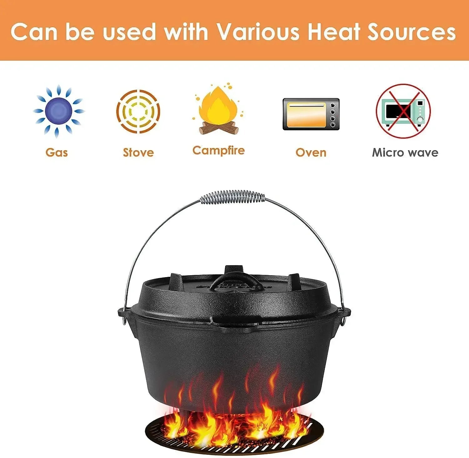 [Excellent Heat Transfer] - The dutch oven is made of extra thick cast iron for even cooking. Cast iron's good heat transfer and special surface structure can effectively store and transfer heat, which makes it especially suitable for outdoor cooking and baking. Just add charcoal or grilled briquettes under the pot and the pot will work.